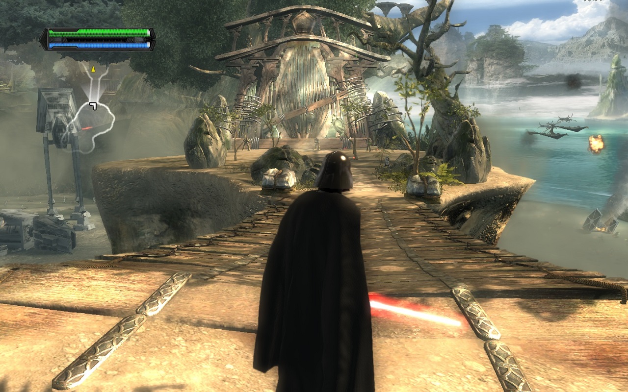 Что касается зрелищности и графики, то она сделана на высшем уровне, учитывая год разработки, конечно. На протяжении всей игры глаз будет радовать красивая анимация комбо ударов со световым мечом, красочные молнии Силы. А так же не оставят равнодушными удачно подобранные фильтры, которые создают потрясающую атмосферность событий. Прорисовка героев заслуживает похвалы, многие современные игры выполнены гораздо хуже, во всяком случае, вам не придется наблюдать за разговором двух квадратов.