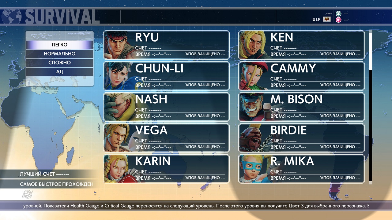 Всего в игре шестнадцать персонажей с возможностью кастомизации. По большей части Street Fighter V рассчитан на то, что вы выберете одного и будете упорно играть на нем, пока не сможете выдавать комбо даже во сне. Количество сыгранного времени и боев учитывается в вашем личном профиле. Всего они поделены на четыре стиля игры и в каждом из них есть свой боец для того, чтобы начать осваивать класс. Помните о очень большой разнице в персонажах, некоторые имеет огромное количество комбо, которые нужно знать, если вы не будете их использовать, то значит, растрачиваете потенциал вашего героя за зря, лучше взять более простого персонажа.