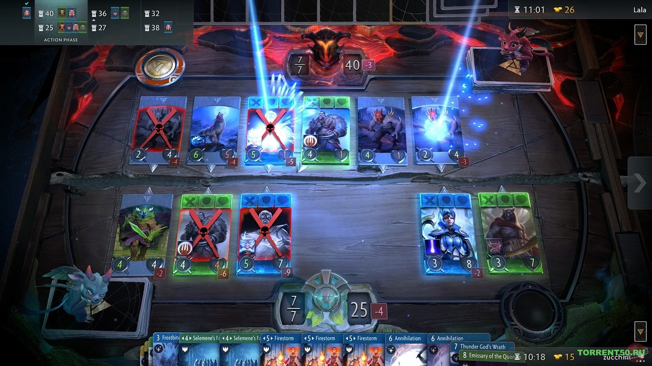 Если вы знакомы с такой известной игрой, как "Dota 2", то тогда сюжет для вас будет понятен. Как и в вышеуказанной игре, главная задача персонажей свергнуть противников с трона, путем применения различных уловок, да и просто выбора грамотного персонажа, которые представлены определенными навыками и силами. Возможно такое, что игрок может выиграть даже, если не будет применять магию вовсе, а просто применит силу к противнику. Однако, бывают такие миссии, в которых без магических сил не обойтись, что также важно рассчитывать. Главное отличие заключается в том, что тут существуют карточки разных цветов, начиная от красного, заканчивая синим. Далее стоит упомянуть деталь, почему карточки маркируются разными цветами. К примеру, синие карты - это персонажи, которые обладают магическими способностями, но важно всегда смотреть и на другие параметры персонажа. В свою очередь, красные карточки представляют персонажей, которые очень развиты физически, хотя совершенно не обладают магическими силами. Для того, чтобы выиграть, нужно будет разрушить не только трон, но и рядом расположенные башни. После чего идет сражение карт, сравнение характеристик и сил персонажей. Помимо того, что все персонажи имеют определенную маркировку, чтобы их было легче отличать, как уже было сказано ранее, существуют и другие параметры, к примеру: урон, здоровье и броня. Разумеется, что параметры персонажей могут повышаться за счет каких либо предметов, либо примененных баллов. Для того, чтобы игрок не запутался, были созданы окна информации, где можно найти также и подсказки. Таким образом, игра Artifact действительно стоит того, чтобы ее скачали торрент, так как несмотря на некоторую схожесть с именитой игрой, в ней есть свои особенности и фишки, которую отделяют ее от "Dota 2". В том числе, естественность и декорации также вносят свою пользу в игровой режим.