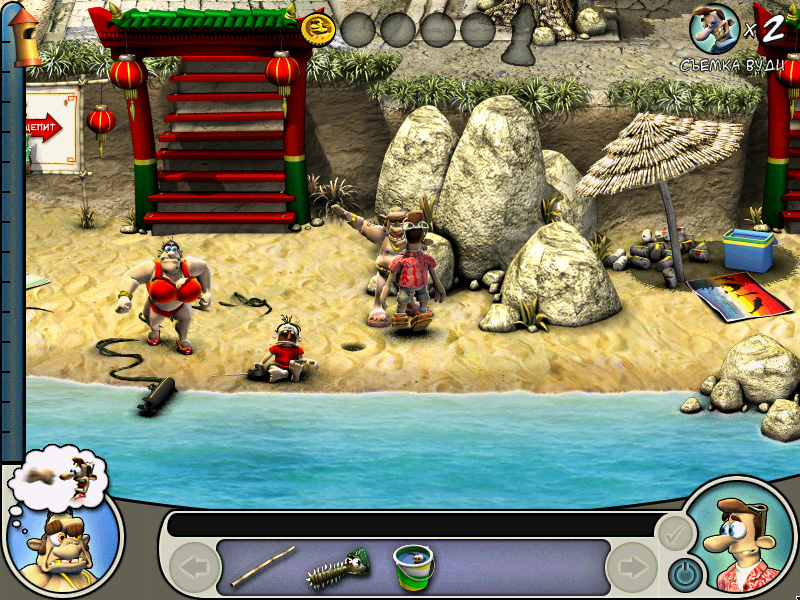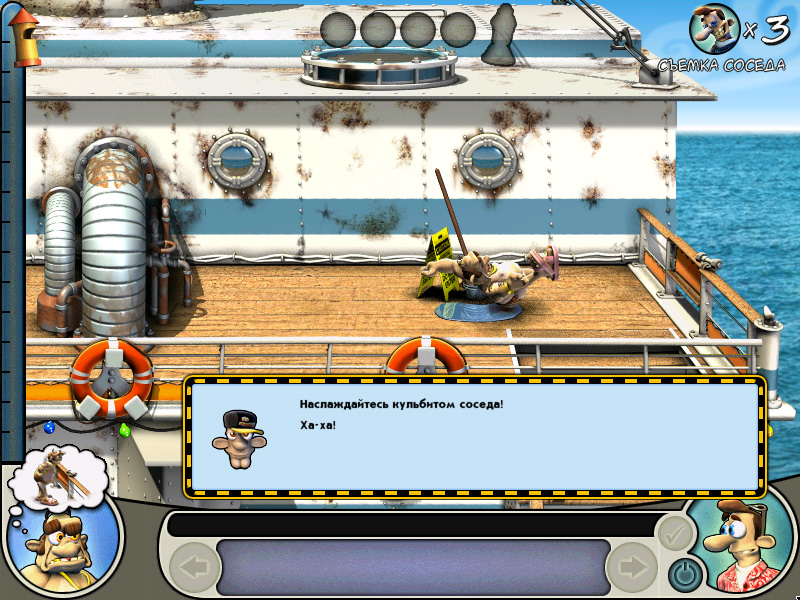 Во второй части «Как достать соседа» добавляется новый персонаж – мама мистера Ротвейлера. Эта тучная дама весьма колоритный герой, с ней постоянно находится злющая собачка, которая обожает гадить на пляже и портить все, что попадется ей в зубы. Таким образом, мы можем чувствовать, что у нас таки есть моральное право на сучение этих двух объектов. Вместо процентов первой части, тут вам будут давать золотые монетки за шалости. Если подстроить их выполнение одну за другой, то можно получить на одну монетку больше за последующие шалости. Вся суть в датчике злости соседа, чем выше он, тем больше бонусов. Количество монеток повлияет на качество прохождения уровня.