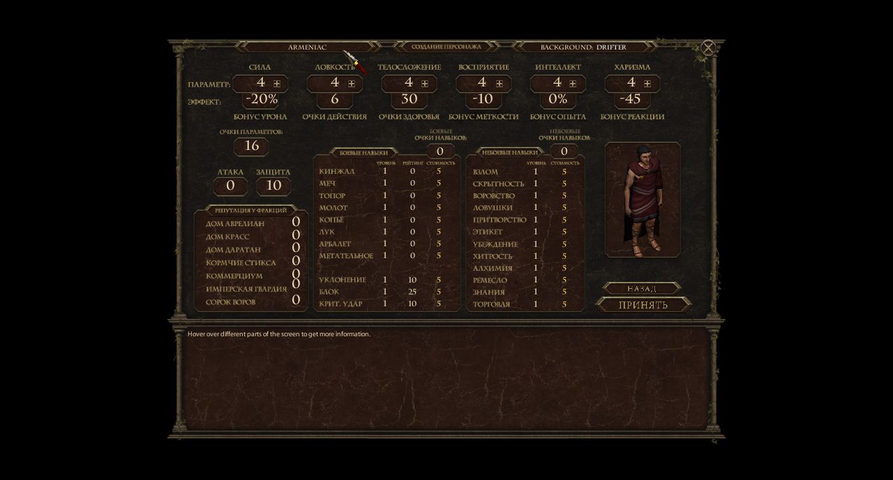 Выбрать главного героя мы можем сами, мало того, у нас просто огромнейший набор инструментов для тончайшей его настройки. Итак, начнем с того, что вам будет предложено восемь историй, которые определяют ваше прошлое и очень сильно повлияют на будущее развитие. Например, можно начать с простого бродяги или же сразу войти в мир славным претором служащим одному из лордов, есть более прозаичные варианты вроде наемного убийцы. Одним словом, выбрать есть из чего и каждая история не банальна и интересна. Тут вас не будут вешать лапшу на уши, говоря, что у вас великое предназначение и тому подобные эпичные факты вашей биографии. Вы простой житель мира, начинаете в городке под названием Терон.