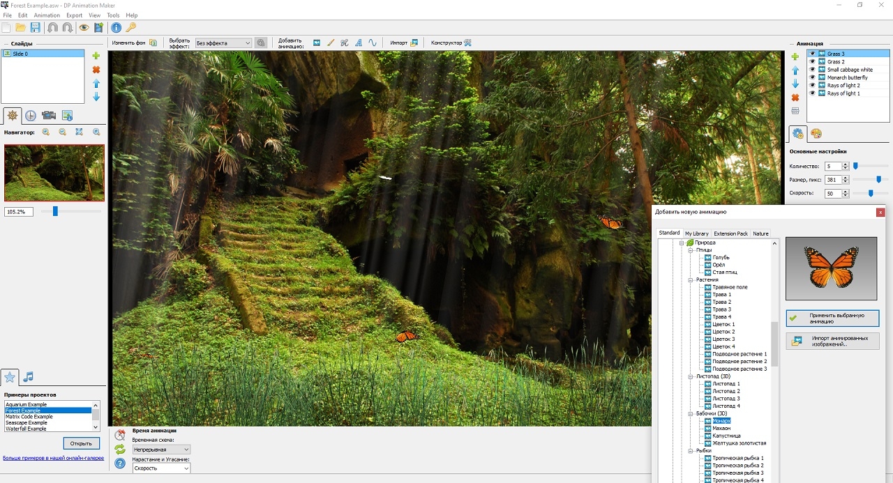 Редактор анимации DP Animation Make имеет большой список спецэффектов из разных областей: за исключением эффектов кисти. Разработка анимационных сцен занимает всего несколько минут; При желании можно добавить увлекательные эффекты, превращающие каждое статичное изображение в уникальный объект. DP Animation Maker позволяет пользователю использовать уже загруженные модели, а также предлагает все возможности для разработки уникального проекта. Для работы с DP Animation Maker не требуется специального опыта использования редакторов анимации. Здесь все интуитивно просто, поэтому справится любой новичок. Для разработки анимации пользователю необходимо загрузить статическое изображение, которое ему нравится, а затем нажать кнопку смены фона и добавить анимацию одноименной кнопкой. Товары можно импортировать в любом количестве. При необходимости пользователь может импортировать анимации в формате GIF и изменить их параметры в настройках слева.